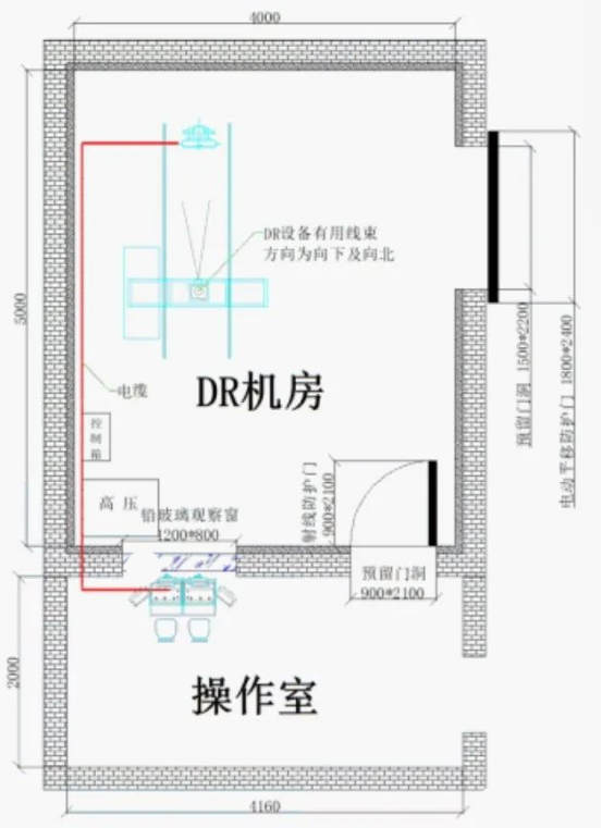 固定式DR用房由控制室和機(jī)房組成,機(jī)房內(nèi)最小有效面積至少需要20平米,機(jī)房內(nèi)最小單邊長度3.5米,控制室一般為8~10平米。控制室和機(jī)房布局一般呈直線形,但設(shè)置在發(fā)熱門診或者感染樓用于發(fā)熱患者檢查的DR在控制室與緩沖室之間應(yīng)設(shè)置緩沖間。