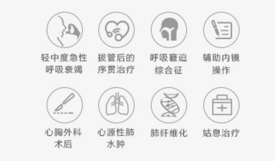 輕中度急性呼吸衰竭、ARDS呼吸窘迫綜合癥、肺纖維化、心源性肺水腫以及拔管后的序貫治療、心胸外科術(shù)后治療、姑息治療、輔助內(nèi)鏡操作等。